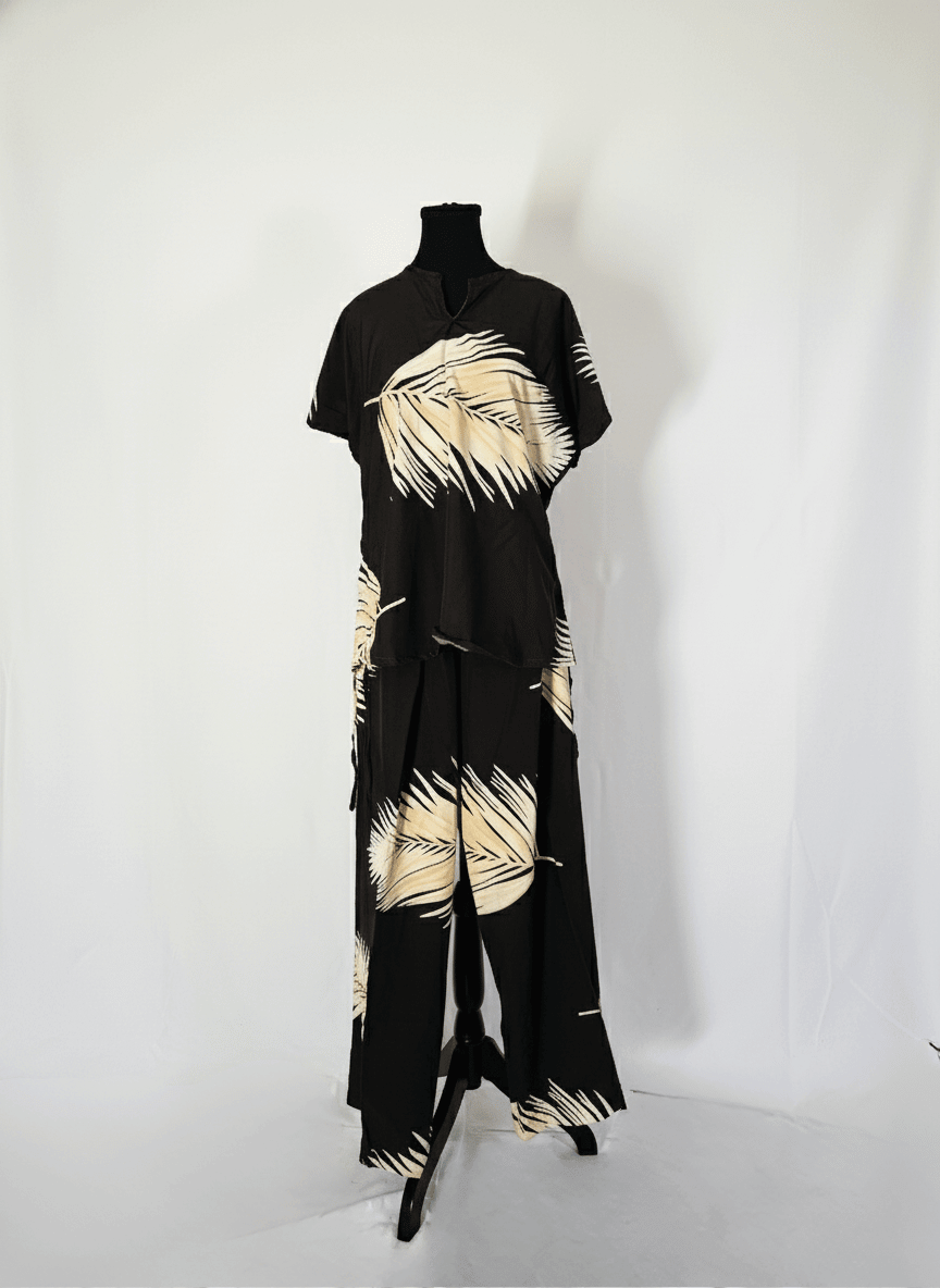 The Cocoa Palm 2-Piece Set blends tropical ease with timeless sophistication. Featuring a relaxed short-sleeve top and matching wide-leg trousers, it’s adorned with soft beige palm prints on a rich cocoa-brown base. Lightweight and breezy, this set is perfect for effortless style — from daytime lounging to casual chic outings.