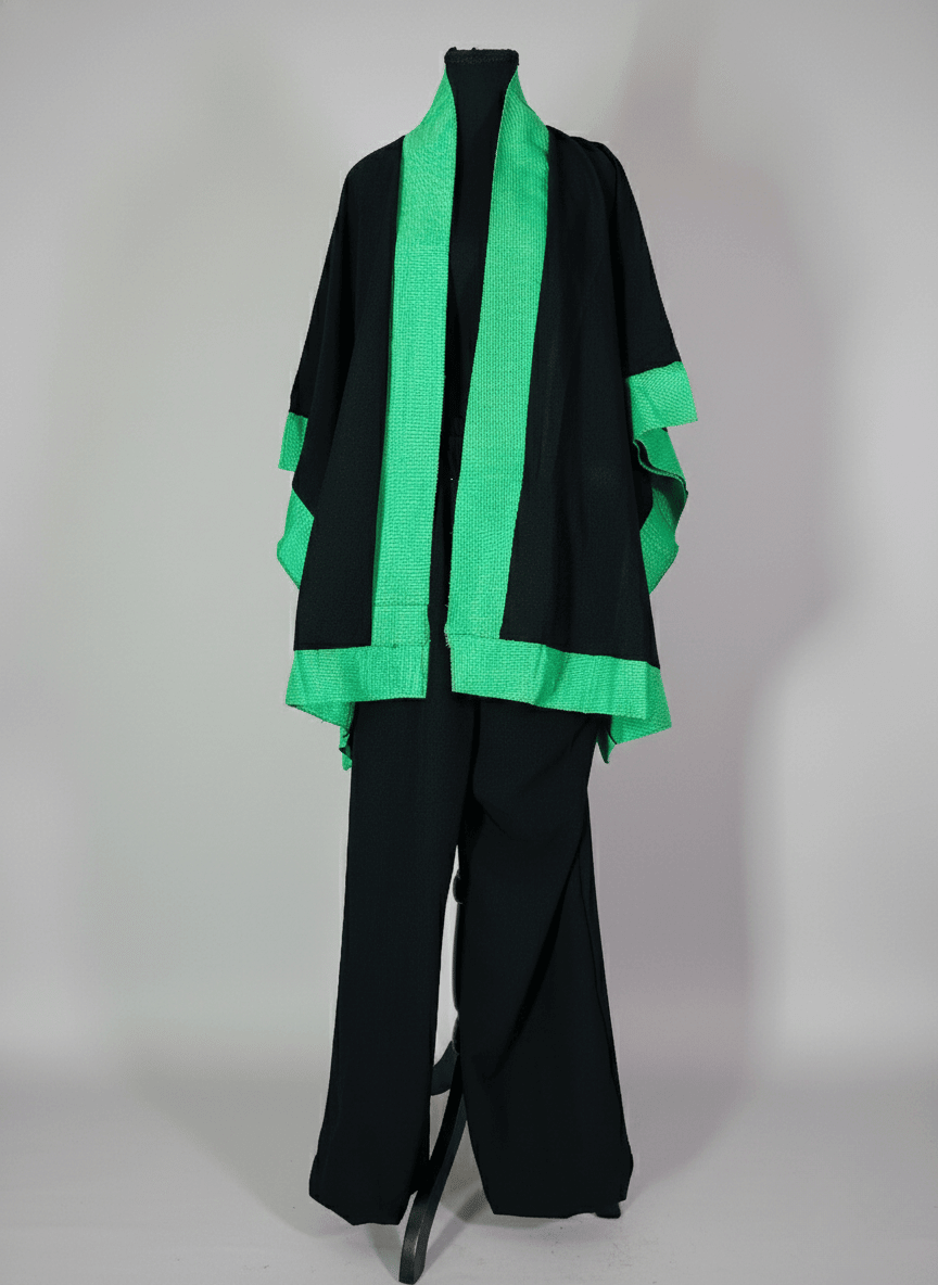 The Emerald Asooke Kimono Set blends contemporary tailoring with traditional luxury. Crafted in sleek black fabric and accentuated with rich emerald Asooke along the collar and cuffs, it features wide-leg trousers for a relaxed, flattering fit. Effortlessly elegant, this set transitions seamlessly from casual sophistication to standout occasion wear.