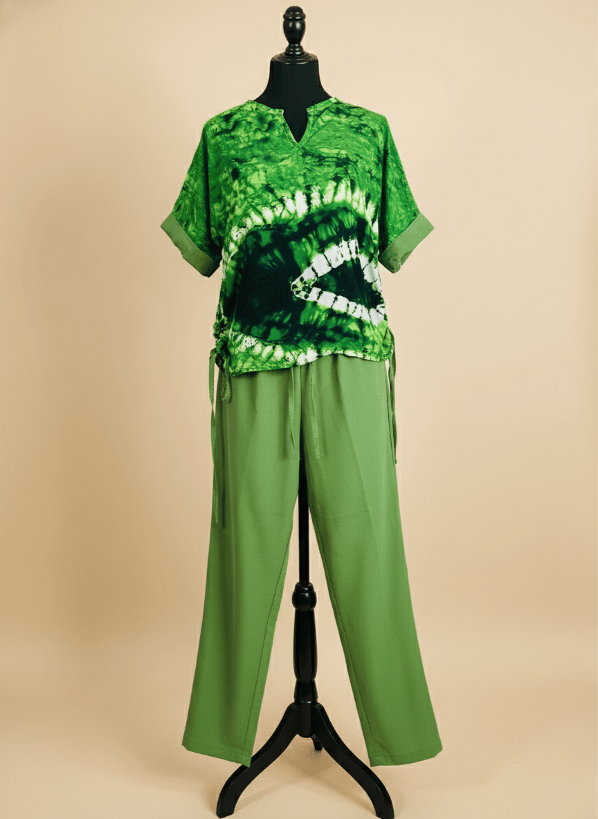 Make a bold statement in comfort and colour. This hand-dyed green battik set features a relaxed top with side ties and matching wide-leg trousers. Designed for an easy, breathable fit that flatters every shape — perfect for casual outings or effortless style days.