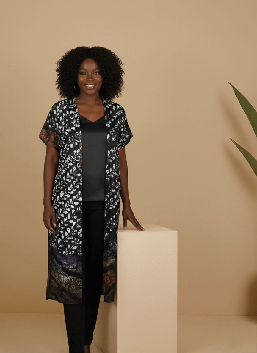 A chic black-and-white 2-piece with delicate leaf-inspired patterns, finished with deep earthy tones at the hem. Perfect for layering, it adds a touch of elegance to both casual and formal outfits.