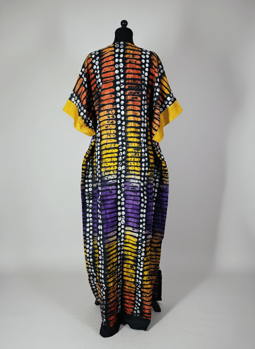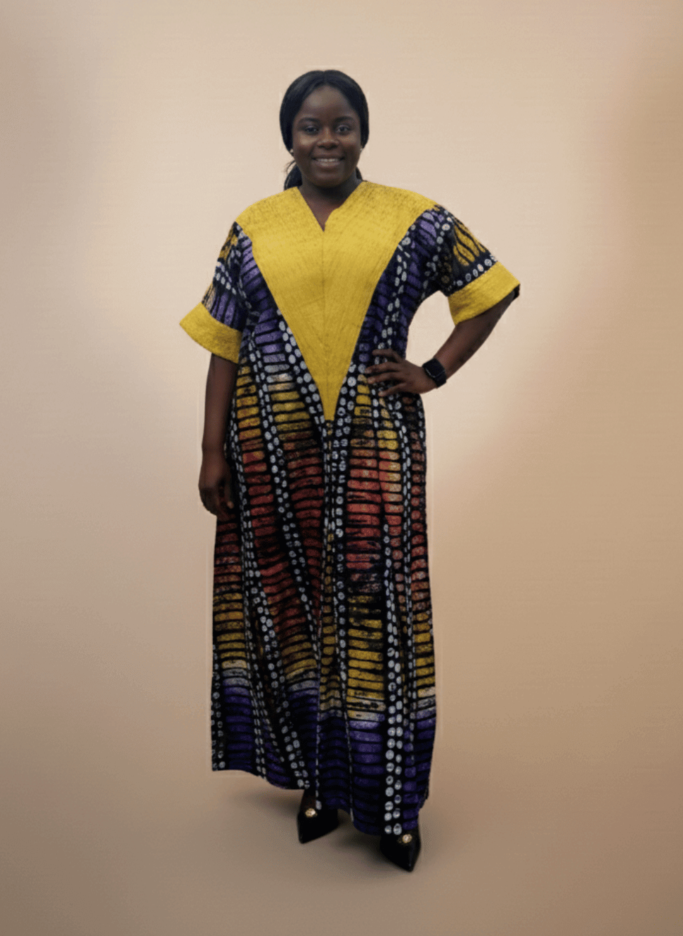 The Sunburst Adire Bubu with Asooke Neckline radiates vibrant elegance in a blend of yellow, orange, and purple hues. Crafted from hand-dyed Adire fabric and finished with a rich golden Asooke neckline and sleeves, this free-size bubu (Bust: 52″, Length: 59″) captures the perfect balance of tradition, colour, and contemporary flair.