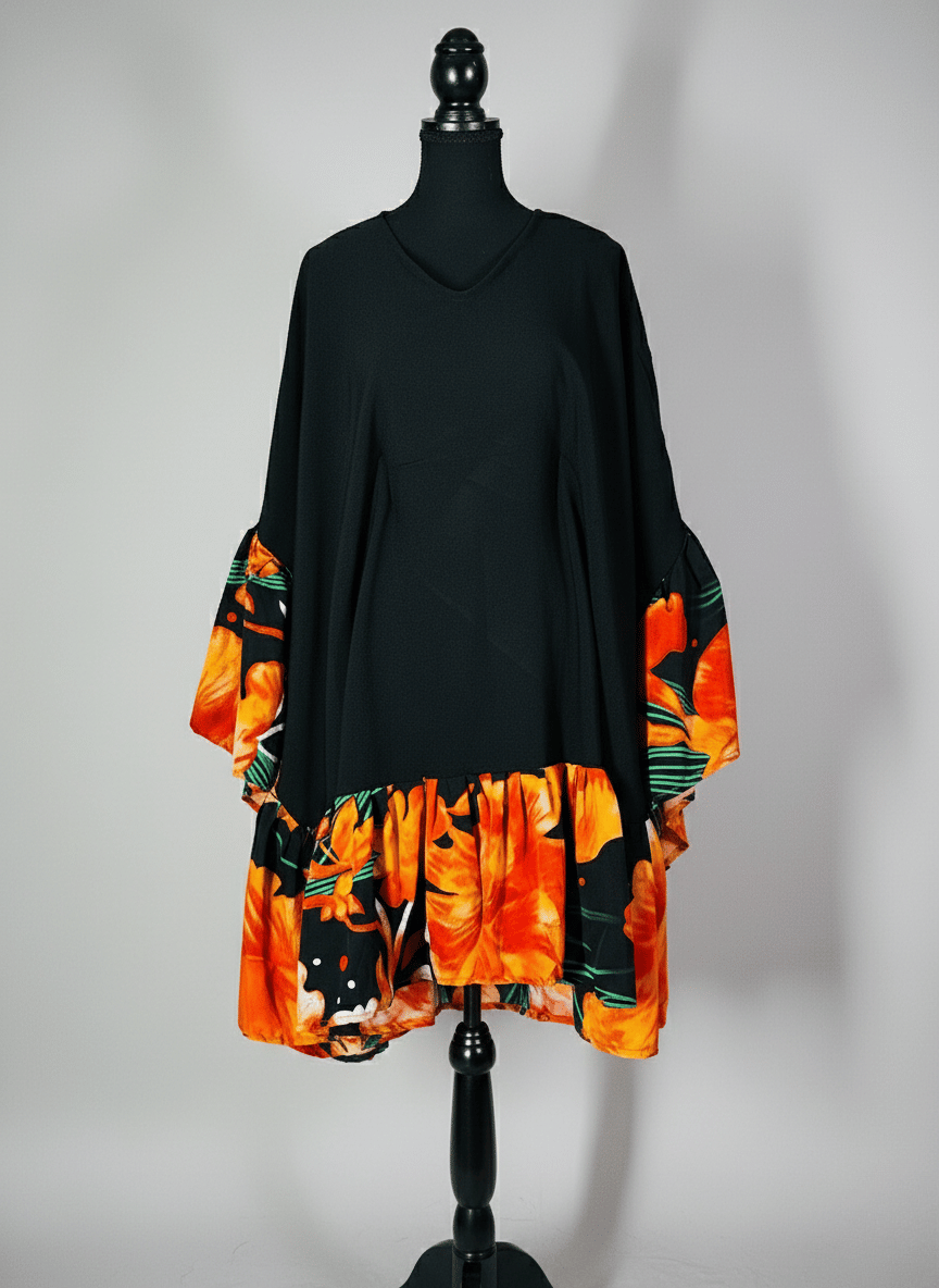 This black midi poncho dress combines classic elegance with vibrant orange florals. The flowing silhouette is accented by ruffles with orange floral detailing, while an internal belt ensures a flattering, well-fitted shape that complements every figure.