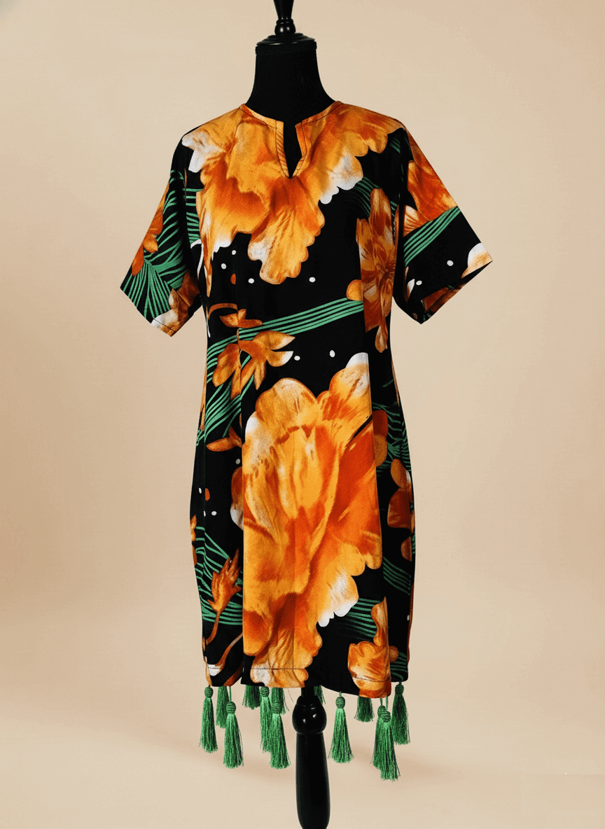 The Tropical Bloom Tassel Dress bursts with vibrant orange florals against a black backdrop, accented with lush green leaves and playful green tassels. Its relaxed silhouette offers effortless charm and comfort — perfect for sunny days or casual outings.